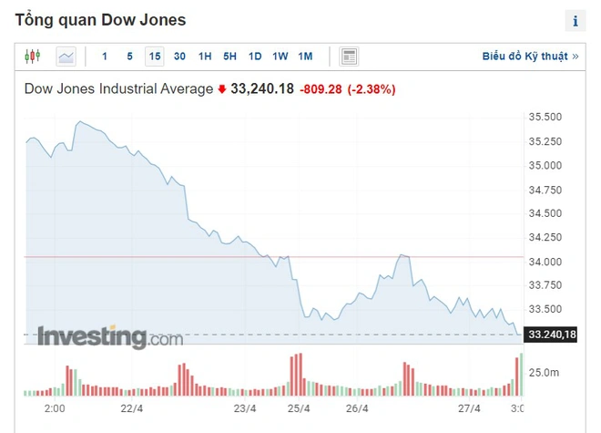 Cụ thể, chỉ số Dow Jones giảm 809 điểm (-2,38%), S&P 500 giảm 120,9 điểm (-2,81%), Nasdaq 100 giảm 514,1 điểm (-3,95%). Như vậy, tính riêng trong tháng 4, S&P 500 đã giảm 7,8%, Nasdaq giảm 12,2% còn Dow Jones giảm 4,2%.