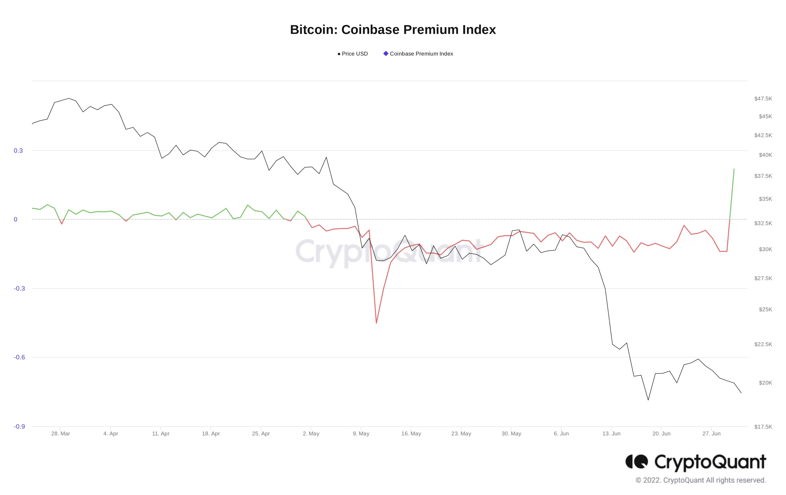 Theo ghi nhận của nền tảng tương tự trên chuỗi CryptoQuant, cái gọi là “Coinbase Premium” đã quay trở lại lãnh thổ tích cực lần đầu tiên sau hai tháng vào ngày 30 tháng 6.