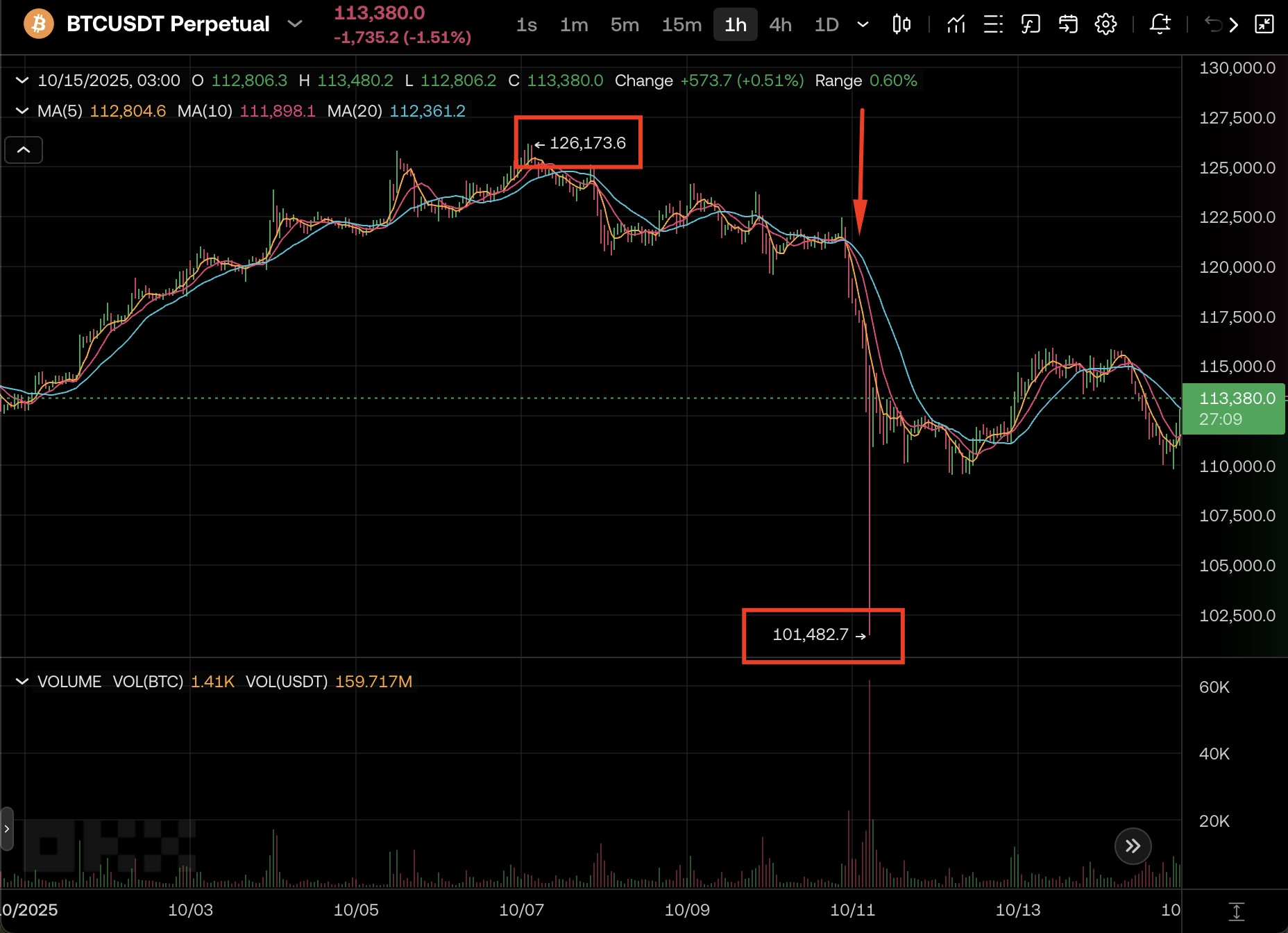 Tuy nhiên, chỉ ba ngày sau, vào ngày 11 tháng 10 năm 2025, thị trường tiền điện tử đã chịu cú giảm mạnh nhất trong lịch sử gần đây. Một cách bất ngờ, thị trường toàn cầu đã sụp đổ, với Bitcoin giảm mạnh 19,56%, rơi xuống dưới 102.000 USD trong vòng vài giờ sau khi Tổng thống Mỹ Donald Trump công bố các mức thuế quan mạnh tay — bao gồm thuế 100% đối với hàng hóa xuất khẩu của Trung Quốc và các biện pháp kiểm soát mới đối với khoáng sản đất hiếm. (Reuters, 2025).