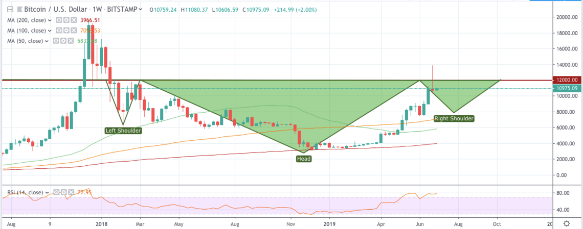 Bất kể tiền điện tử đầu tiên bị trả ở mức 9.000 đô la hay 7.000 đô la, các nhà đầu tư dài hạn không nên lo lắng. Bitcoin đang tạo ra một mô hình đầu và vai nghịch đảo lớn trên biểu đồ hàng tuần với đường viền cổ tại đường kháng cự 12.000 đô la.