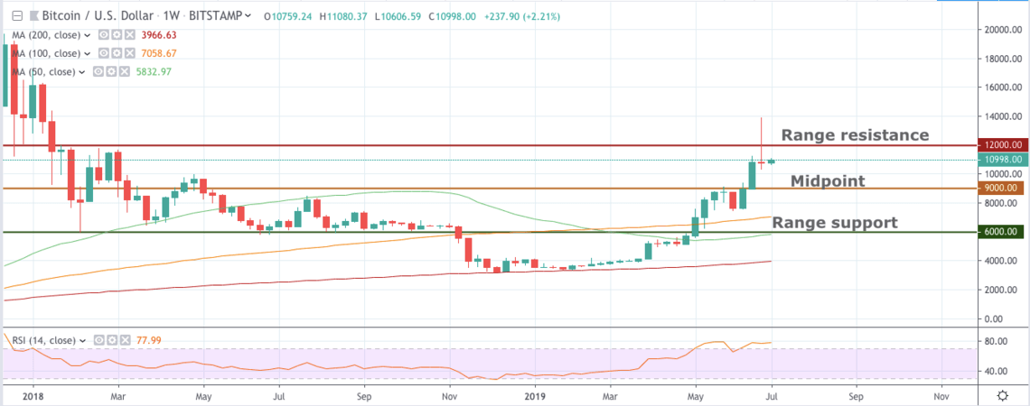 Mẫu phù hợp với mục tiêu giá chọn đáy ban đầu của chúng tôi là $ 9.000. Hỗ trợ $ 9.000 hiện là trung điểm phạm vi của chúng tôi từ góc độ vĩ mô. Vào thời điểm đó, bitcoin sẽ giảm hơn 35% so với mức cao năm 2019 là $ 13,880.