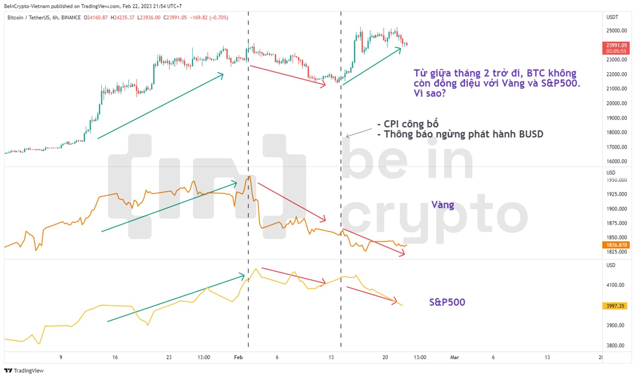 - Nhưng sự đồng điệu bị mất vào giữa tháng hai. Thời điểm này, CPI Hoa Kỳ tháng 1được công bố và nội bộ thị trường có sự kiện BUSD ngưng được phát hành.