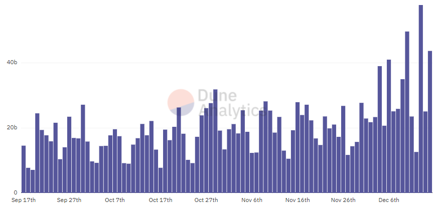 Cùng với sự sụt giảm của thị trường vào tháng 5 và sự suy yếu và điều kiện thị trường biến động gần đây là sự gia tăng khối lượng stablecoin được giao dịch. Khối lượng giao dịch vào ngày 14 tháng 12 đã tăng vọt lên 57 tỷ USD trong khi mức trung bình hàng ngày luôn nằm trong khoảng từ 10 đến 20 tỷ USD.