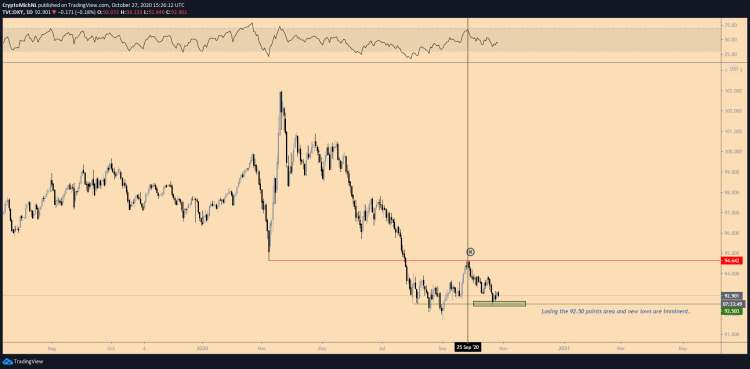 Nếu đồng đô la giữ vùng hỗ trợ 92,50, thì cũng có khả năng xảy ra sự đảo chiều đối với giá Bitcoin. Điều này có nghĩa là một sự điều chỉnh trong thị trường tiền điện tử, không hề giảm giá.
