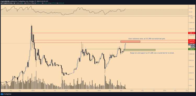 Biểu đồ hàng tuần cho thấy một vùng kháng cự rõ ràng giữa $13,500 – $14,250 là rào cản lớn tiếp theo đối với thị trường.