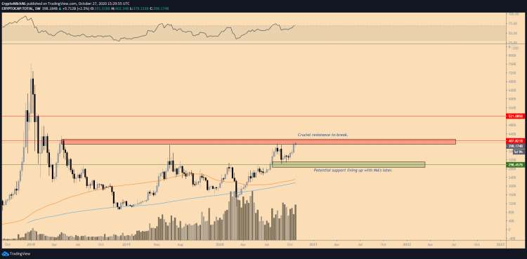 Hiện tại, tổng vốn hóa thị trường đang ở trong một vùng kháng cự lớn, vì mức $400 – $410 tỷ là một trục quan trọng.
