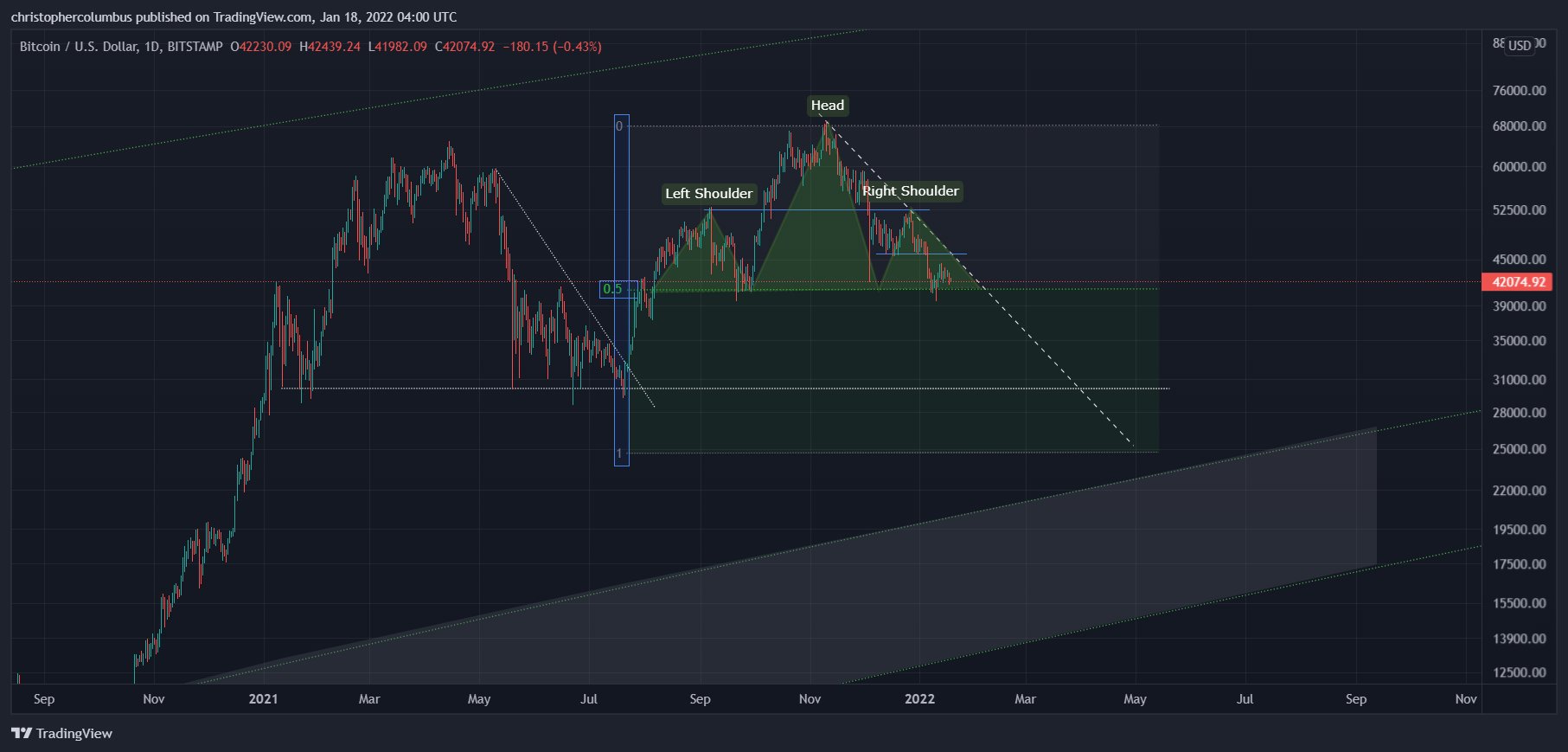 Dave the Wave sử dụng phần mở rộng Fibonacci, đồng thời xác định mô hình vai đầu vai giảm giá có thể có để đánh giá mục tiêu giảm giá là 25.000 USD cho BTC.