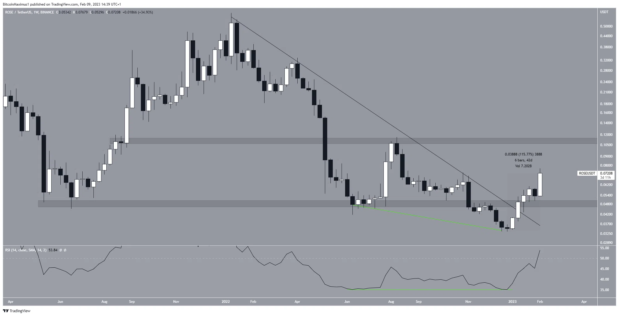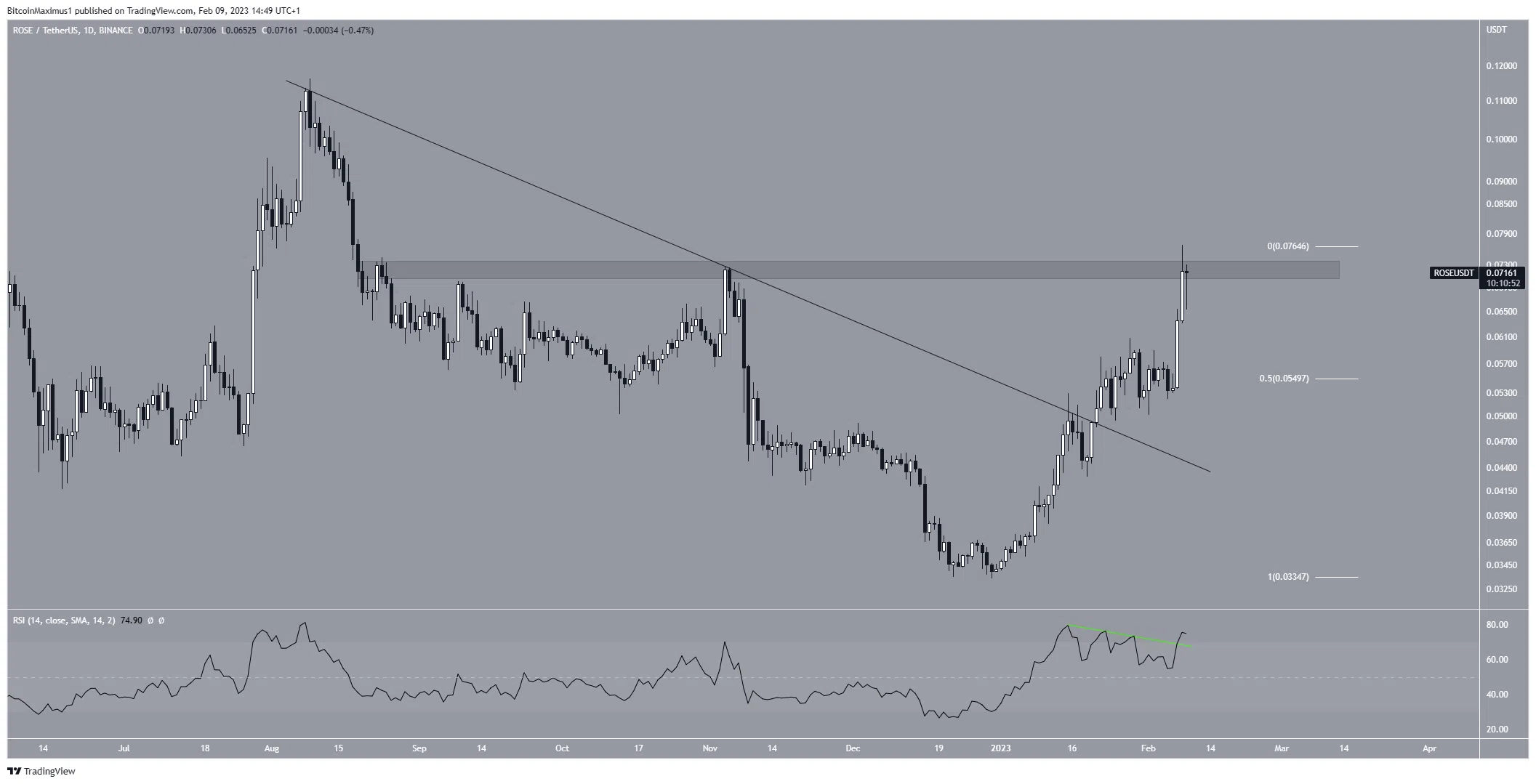 Giá ROSE đã tăng 115% kể từ đầu năm. Chuyển động đi lên đã dẫn đến mức cao 0,077 USD vào ngày 9 tháng 2. Quan trọng hơn, hành động giá đưa ra hai dấu hiệu tăng giá quyết định.