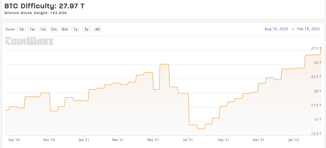 Công cụ phân tích trên chuỗi CoinWarz đã chỉ ra vào ngày 18 tháng 2 rằng độ khó khai thác đạt mức cao mới là 27,97 nghìn tỷ băm (T). Đây là lần thứ hai sau ba tuần Bitcoin (BTC) đạt mức ATH mới về độ khó. Vào ngày 23 tháng 1, độ khó đạt 26,7 T khi tốc độ băm ở mức 190,71 EH/s (exahashes mỗi giây).