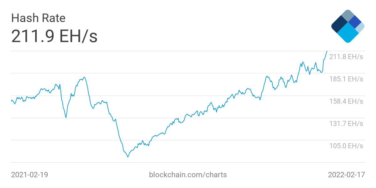 Tỷ lệ băm cho mạng cũng đã đạt mức ATH mới theo dữ liệu từ Blockchain.com, cho thấy tỷ lệ băm là 211,9 EH/s. Các công cụ đo lường khác nhau đã ghi nhận các mức cao nhất khác nhau về tốc độ băm trong vài tuần qua. YCharts đã hiển thị tỷ lệ băm đạt ATH là 248,11 EH/s vào ngày 13 tháng 2.