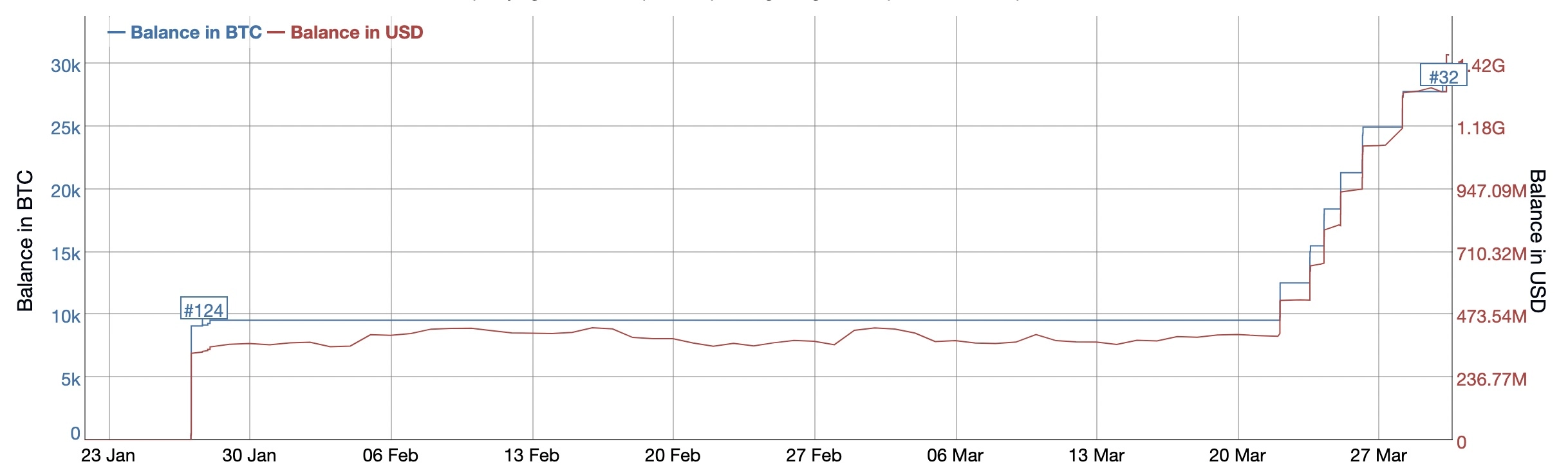 Vào ngày 30 tháng 3, một ví Bitcoin thuộc LFG (Luna Foundation Guard) đã tích lũy được 139 triệu USD BTC, nâng tổng kho bạc của nó lên 31.000 BTC hoặc 1,47 tỷ USD.