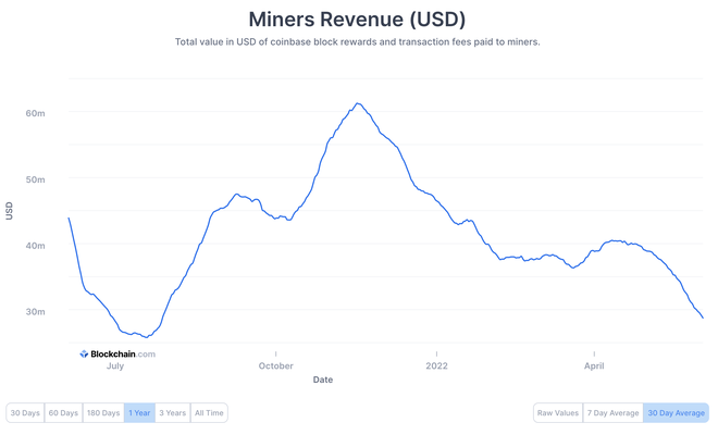 Theo dữ liệu từ Blockchain.com, doanh thu khai thác hàng ngày của các thợ đào đã giảm khoảng 27% vào tháng 5. Hôm 1/5, doanh thu hàng ngày của toàn bộ máy đào Bitcoin đạt 40,57 triệu USD. Đến cuối tháng 5, con số này giảm xuống còn 29,37 triệu USD.
