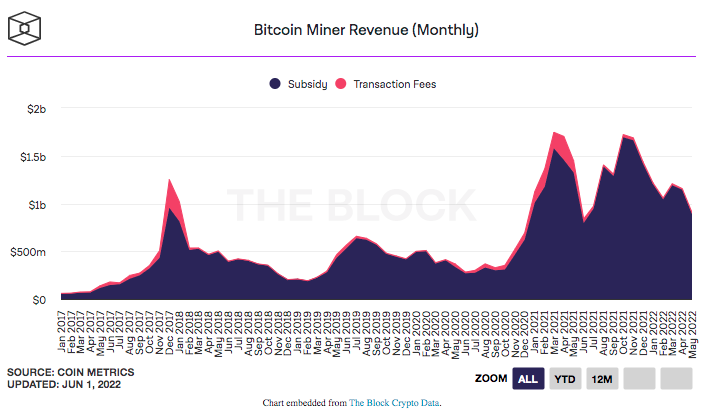 Doanh thu khai thác bitcoin trong tháng 5 đã giảm 21,6%, theo dữ liệu do The Block Research tổng hợp.