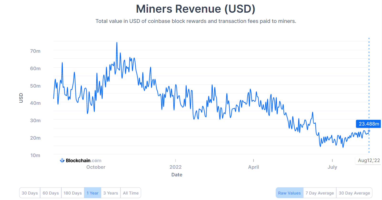 Dữ liệu từ blockchain.com xác nhận rằng doanh thu khai thác BTC đã tăng gần 69% trong một tháng – từ 13,928 triệu USD vào ngày 13 tháng 7 lên 23,488 triệu USD vào ngày 12 tháng 8. Sự gia tăng đáng kể trong doanh thu khai thác đảm bảo khai thác Bitcoin là một ngành kinh doanh khả thi mặc dù chi phí hoạt động cao. Ngoài ra, giá thiết bị khai thác (GPU) thấp hơn đã cho phép các thợ đào BTC mở rộng cơ sở hạ tầng hiện có của họ.