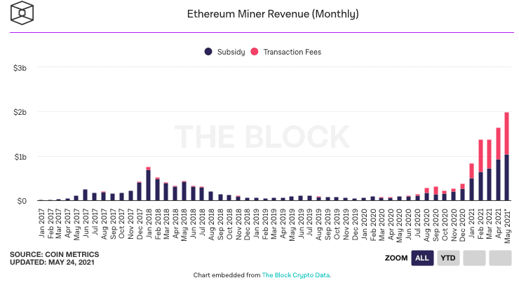 Dữ liệu được thu thập bởi The Block Research cho thấy tính đến ngày 23 tháng 5, các công ty khai thác ETH đã đạt được khoảng 1,93 tỷ đô la doanh thu. Trong số đó, 922,46 triệu đô la dưới dạng phí giao dịch hoặc chi phí liên quan đến giao dịch trên Ethereum. Các khoản trợ cấp cho các miner chiếm 1,01 tỷ đô la còn lại.