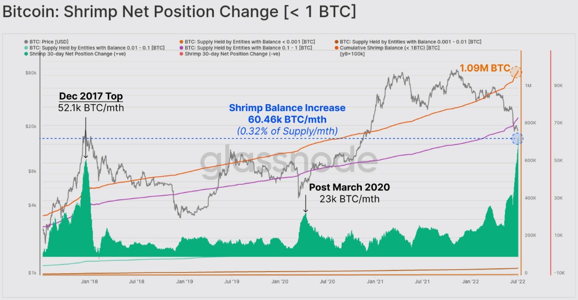 Những chiếc ví được gọi là “shrimp” này đã háo hức kiếm được Bitcoin giá thấp với mức 60.460 BTC mỗi tháng, đây là “tỷ lệ tích cực nhất trong lịch sử”.
