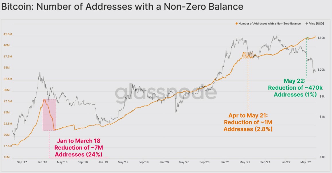 Theo Glassnode, việc thanh lọc đáng kể các ví Bitcoin đang hoạt động là điều thường xảy ra trong các sự kiện bán tháo lớn cũng như trong các thị trường gấu. Tuy nhiên, mức độ nghiêm trọng của cuộc di cư đã giảm dần kể từ thị trường gấu năm 2018, cho thấy rằng “có mức độ quyết tâm ngày càng tăng giữa những người tham gia Bitcoin trung bình”, Glassnode cho biết thêm.
