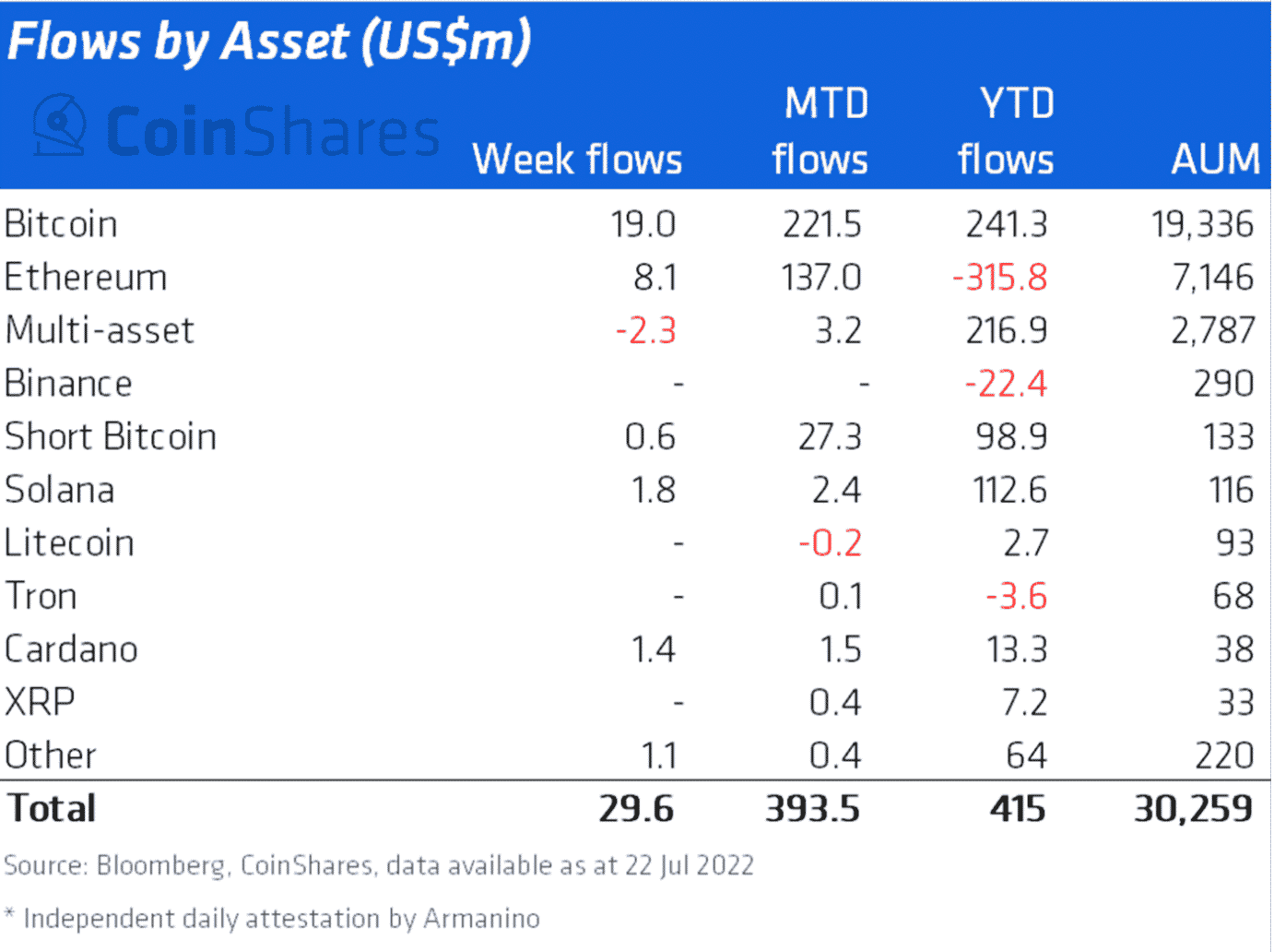 Đối với Ethereum, tổng dòng tiền chảy vào tài sản này trong tuần vừa qua là 120 triệu USD. Với bản cập nhật Merge sắp tới, sự quan tâm của nhà đầu tư đối với Ethereum đang dần trở lại.