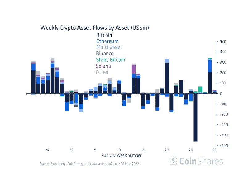 Theo báo cáo của CoinShares, dòng tiền đầu tư vào thị trường tiền điện tử đạt 343 triệu USD trong tuần này. Đây là dòng tiền vào lớn nhất kể từ tháng 11 năm 2021. Tổng dòng tiền chảy vào thị trường tiền điện tử tính từ đầu tháng đã đạt 394 triệu đô la.