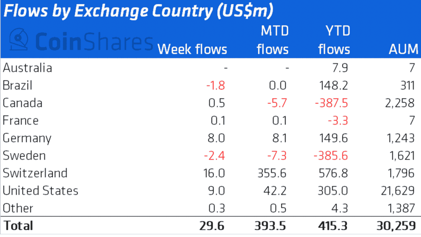 Báo cáo của CoinShares cho thấy hầu hết dòng tiền chảy vào thị trường trong giai đoạn này đến từ Thuỵ Sĩ.