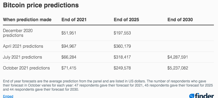 Theo kết quả khảo sát mới được Finder công bố gần đây cho thấy những dự đoán bất ngờ từ các chuyên gia về giá Bitcoin vào cuối năm 2021, 2025 và 2030.