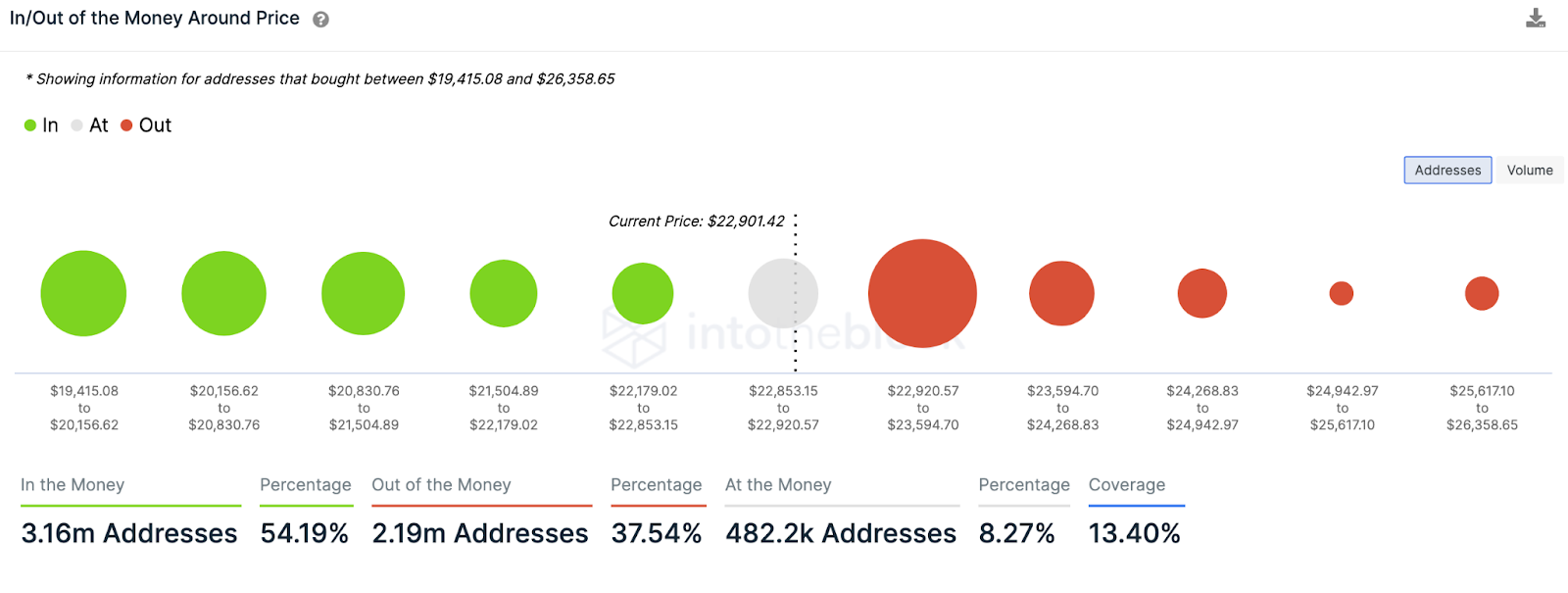 Chỉ báo In/Out of the Money (IOMAP) của BTC là một số liệu theo dõi các địa chỉ ví Bitcoin đang tiến gần đến điểm hòa vốn. Trong lịch sử, những người nắm giữ có xu hướng bán bớt coin của họ khi BTC tiến gần đến giá mua trung bình. Dữ liệu IOMAP của IntoTheBlock chỉ ra rằng mức hỗ trợ trung bình của BTC ở khoảng 22,500 USD yếu hơn đáng kể so với kháng cự ở mức 23,500 USD. Điều này có nghĩa là BTC có vẻ sẽ giảm xuống còn 22,500 USD trong tuần tới.