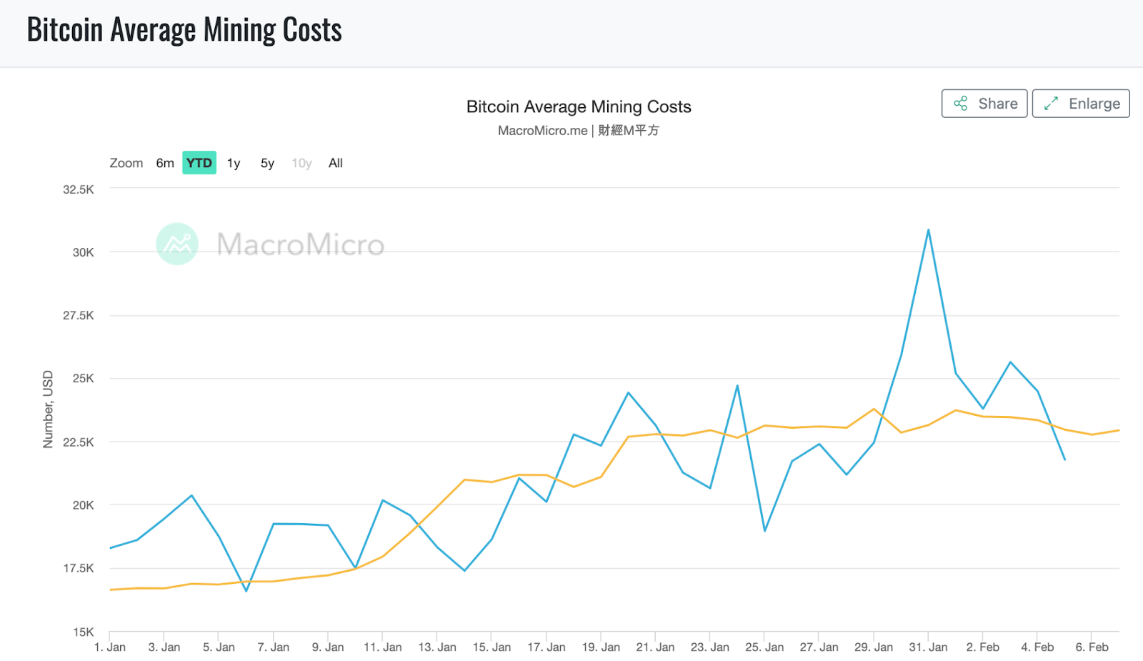 Xu hướng dự trữ của thợ đào sẽ ảnh hưởng đáng kể đến giá Bitcoin trong những ngày tới. Ngay cả trong bối cảnh sự thống trị của BTC đang suy giảm và tâm lý tiêu cực ngày càng tăng, nếu chi phí khai thác ở mức dưới 22,000 USD thì dự đoán BTC có thể chứng kiến một đợt tăng giá khác trong tháng 2.