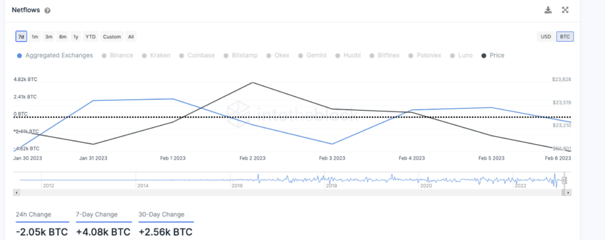 Do có một lượng lớn BTC được mua quanh mức 23.300 USD, việc BTC phá vỡ dưới 22,800 USD có thể kích hoạt một đợt giảm giá mạnh khi nhóm nhà đầu tư tìm cách cắt lỗ. Luồng giao dịch BTC trên các sàn và số lượng địa chỉ ví tiến gần đến điểm hòa vốn cho thấy Bitcoin có thể giảm xuống dưới 22,000 USD một lần nữa. Chỉ số Bitcoin flow trên các sàn giao dịch hàng đầu là một số liệu khác cho thấy tín hiệu giảm giá nhẹ vào tháng 2. Chỉ số này so sánh tỷ lệ BTC được gửi trên các sàn giao dịch với tỷ lệ rút tiền.