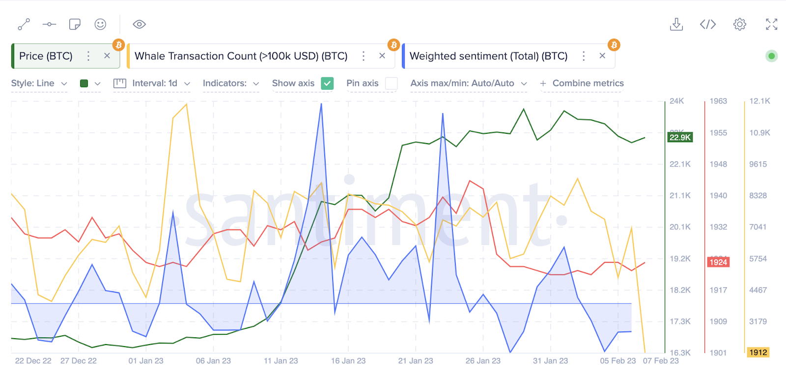 Số lượng giao dịch của cá voi Bitcoin đã giảm kể từ ngày 02/2, trùng với đợt điều chỉnh 4% từ mức 23,800 USD xuống 22,700 USD.