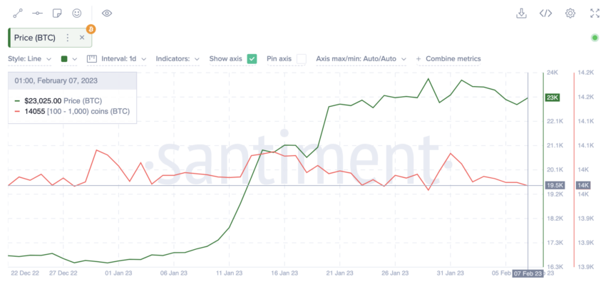 Gần đây, như được nhấn mạnh bởi Santiment, nhóm cá voi nắm giữ từ 100 đến 1,000 BTC đang bán tháo BTC của mình. Đây có thể là một tín hiệu cho thấy Bitcoin có khả năng sẽ tiếp tục duy trì dưới mức 23,000 USD trong tuần tới.