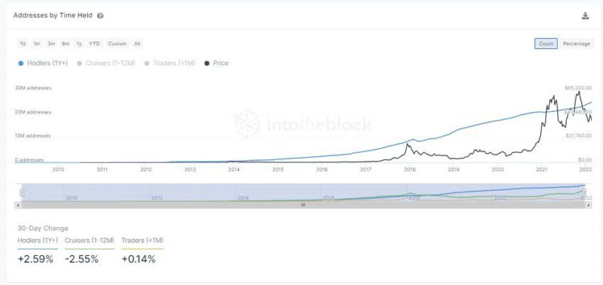 Holder trong dữ liệu sau đây sử dụng chuẩn thời gian là 1 năm. Lượng holders mua BTC và nắm giữ ít nhất một năm đã không ngừng tăng ngay cả trong giai đoạn biến động suy giảm đầu năm 2022.