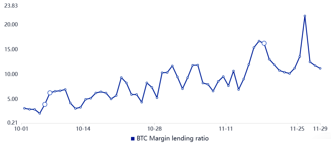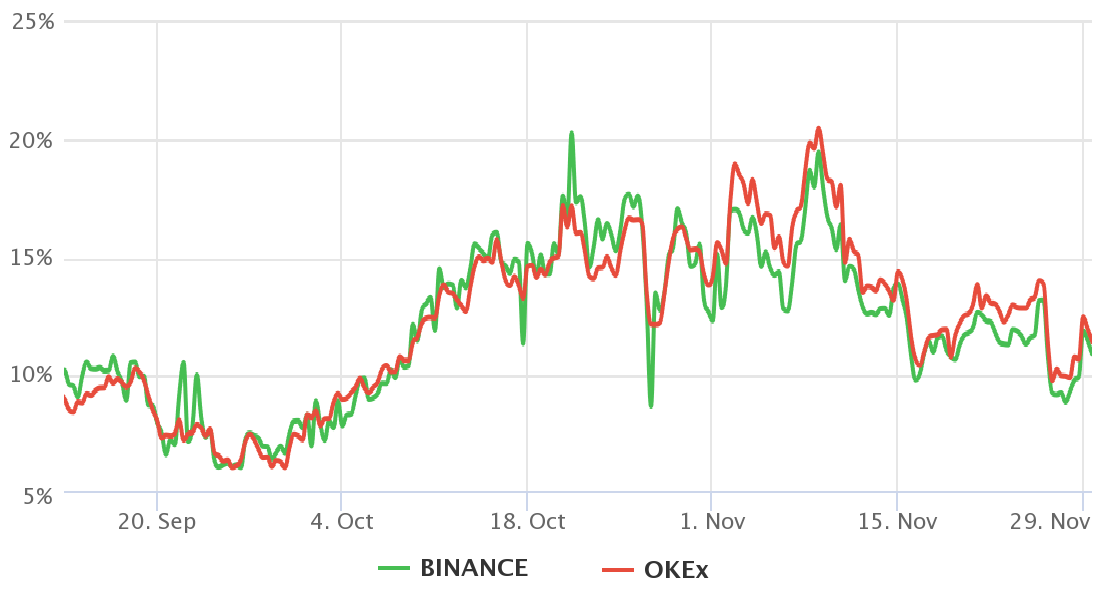 Biểu đồ trên cho thấy các nhà giao dịch gần đây đã vay nhiều Bitcoin hơn, vì tỷ lệ này đã giảm từ 21,9 vào ngày 26 tháng 11 xuống còn 11,3 hiện tại. Tuy nhiên, dữ liệu nghiêng về xu hướng tăng về mặt tuyệt đối vì chỉ báo này ủng hộ việc vay tiền ổn định với biên độ rộng.