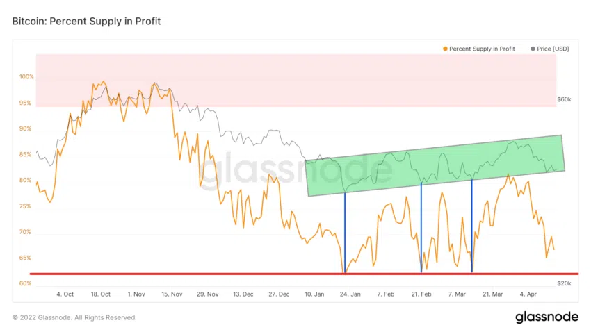 Tính đến năm 2022, chỉ báo Nguồn cung có Lợi nhuận vẫn chưa giảm xuống dưới mức 62.5% (đường màu đỏ). Trong 3 tháng đầu năm nay, chỉ báo này đã bật ra khỏi vùng hỗ trợ quan trọng ba lần, vào ngày 22 tháng 1, ngày 21 tháng 2 và ngày 13 tháng 3, tương ứng với các thời điểm khi giá BTC tụt xuống mức thấp nhất là 34,000 USD, 36,350 USD và 37,555 USD (đường màu xanh lam).