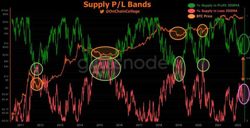 Một biểu đồ khác cung cấp một góc nhìn thú vị về khả năng đầu tư BTC đã được nhà phân tích @OnChainCollege xuất bản. Trong biểu đồ này, Dải P/L Nguồn cung cho thấy hai biểu đồ đối xứng của đường trung bình động 3 ngày nguồn cung có lợi nhuận (xanh lá cây) và lỗ (đỏ).