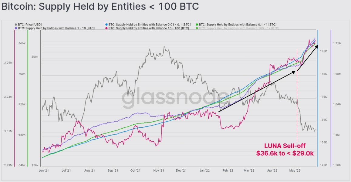 Trong sự biến động gần đây, tổng số dư của các thực thể nắm giữ dưới 100 BTC đã tăng thêm 80.724 BTC, mà Glassnode lưu ý là “tương tự đáng kể với 80.081 BTC ròng mà LUNA Foundation Guard đã thanh lý”.