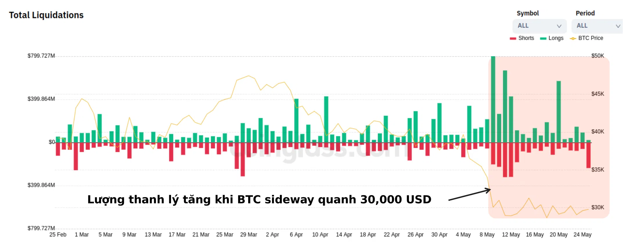 Dữ liệu thanh lý cho thấy, trong hai tuần đầu tháng 5/2022, lượng thanh lý tăng mạnh dù biên độ Bitcoin chỉ 5% – 10% xoay quanh 30,000 USD.