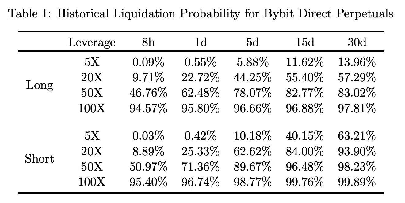 Một thống kê sau từ Bybit cho thấy cơ hội sống sót tùy theo mức đòn bẩy được sử dụng.