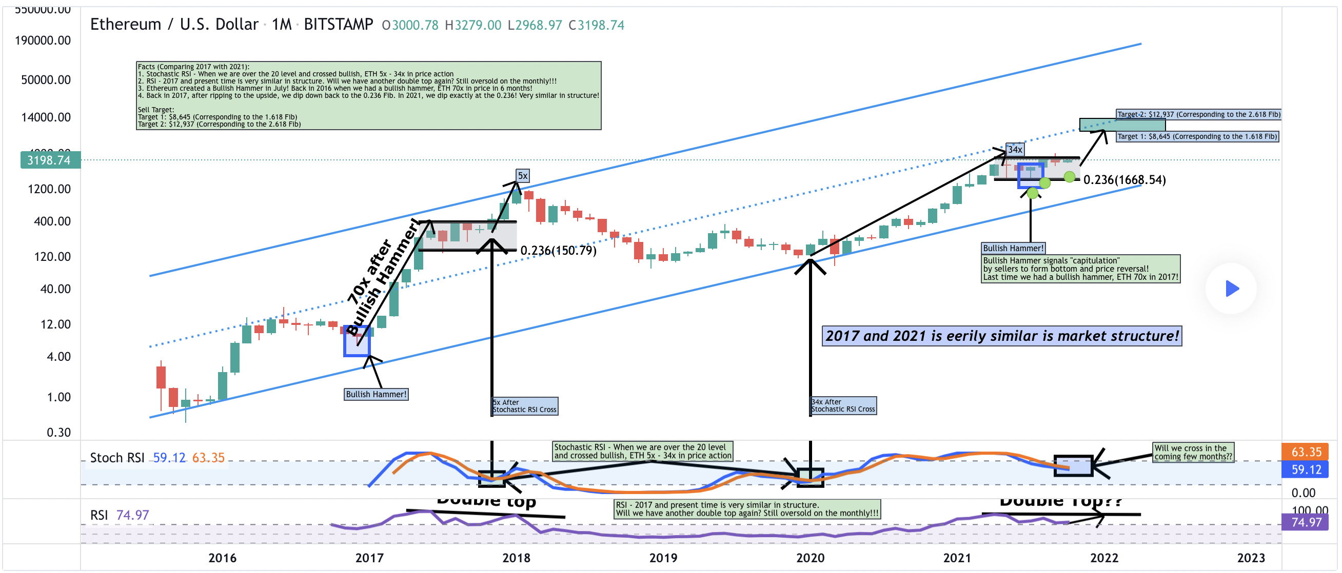 Cụ thể, bốn chỉ báo kỹ thuật là Stochastic RSI, Chỉ số Sức mạnh Tương đối (RSI), Bullish Hammer và mức thoái lui Fibonacci. Nó bắt đầu với sự xuất hiện của Bullish Hammer trên biểu đồ hàng tháng của Ether vào tháng 12 năm 2017, tiếp theo là đợt tăng giá 7.000% trong sáu tháng tới.