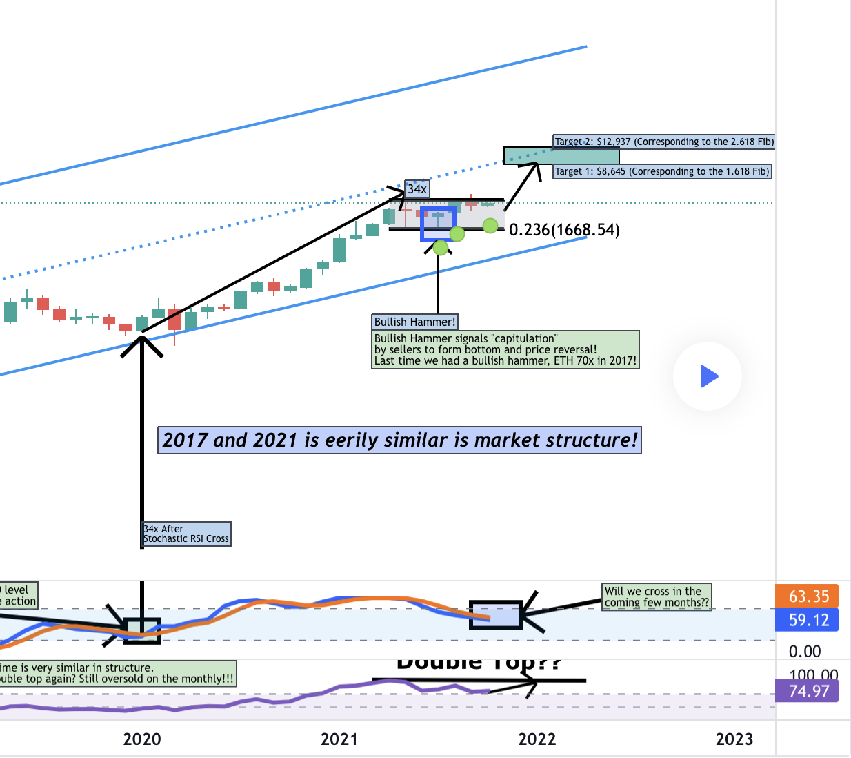 Sự tương tự về xu hướng tăng giá cũng lấy dấu hiệu từ sự giao nhau trong xu hướng tăng giá của Stochastic RSI tiềm năng và một đường RSI đỉnh kép, đang chờ xuất hiện trên biểu đồ hàng tháng của Ether trong “vài tháng tới”, tương tự như biểu đồ trùng khớp với đợt tăng giá 500% vào năm 2018, như đã đề cập ở trên.