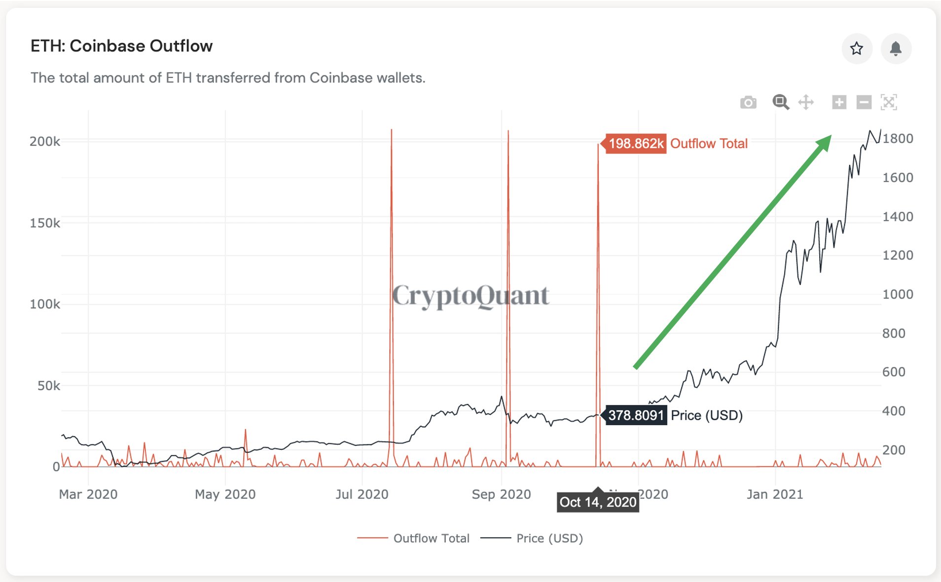 Được xuất bản bởi Ki Young Ju, Giám đốc điều hành của dịch vụ phân tích on-chain CryptoQuant, số liệu rút tiền của Coinbase cho thấy ba đợt rất lớn khoảng 200.000 ETH rời sàn giao dịch chảy vào ví cá nhân vào năm 2020.