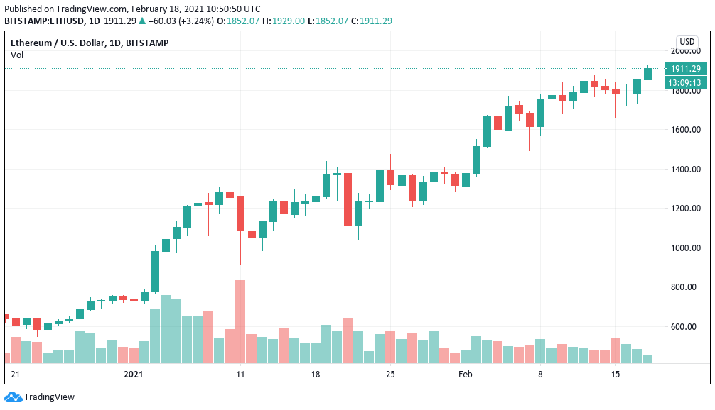 Ether (ETH) đạt mức cao nhất mọi thời đại và gần đạt mức 2.000 đô la lần đầu tiên vào ngày 18 tháng 2 khi động lực quay trở lại.
