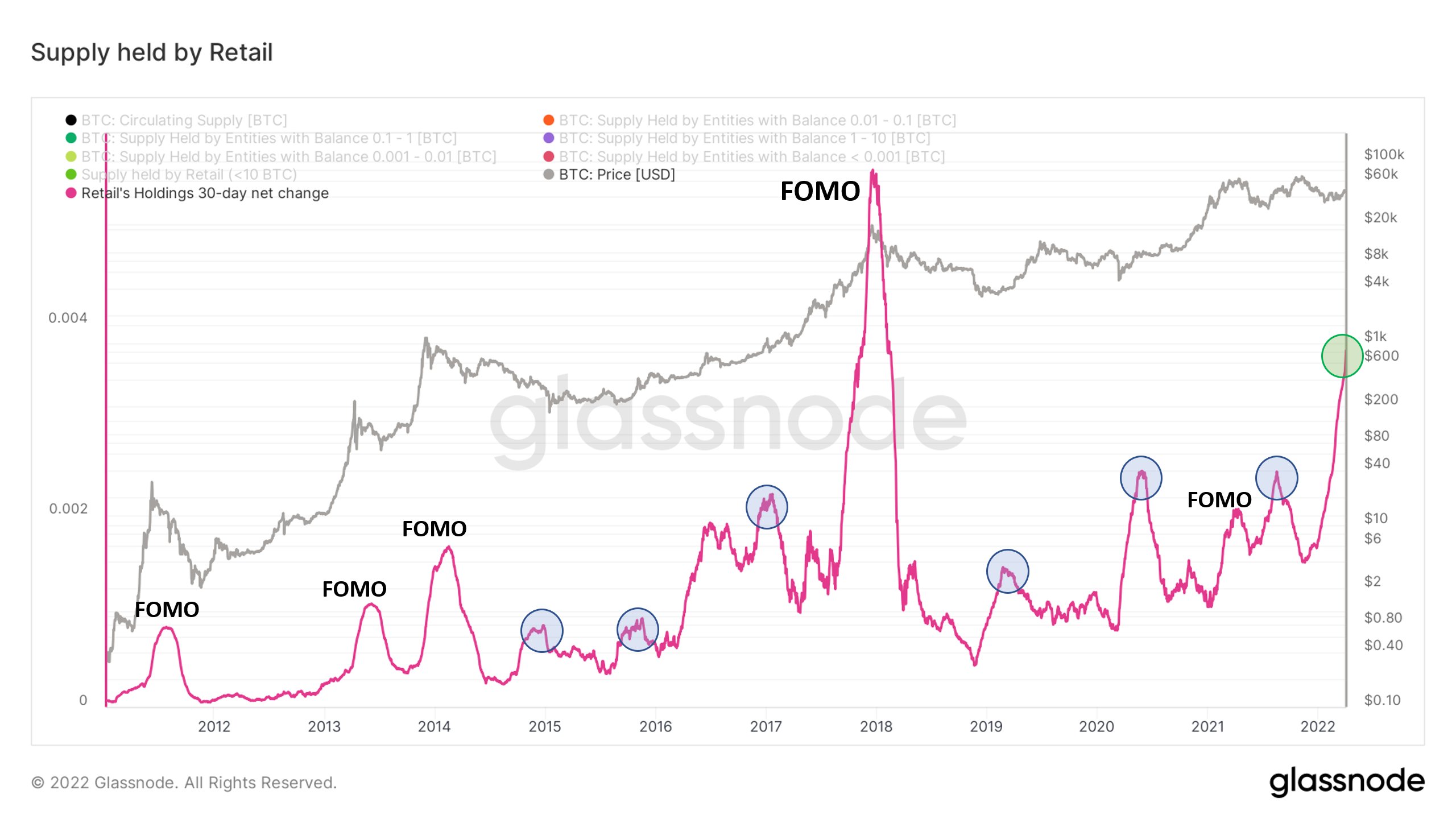“Đây là một biểu đồ thực sự thú vị. Bán lẻ (0-1 BTC) hiện đang mua với tỷ lệ cao thứ hai trong lịch sử của Bitcoin”, ông nhận xét.