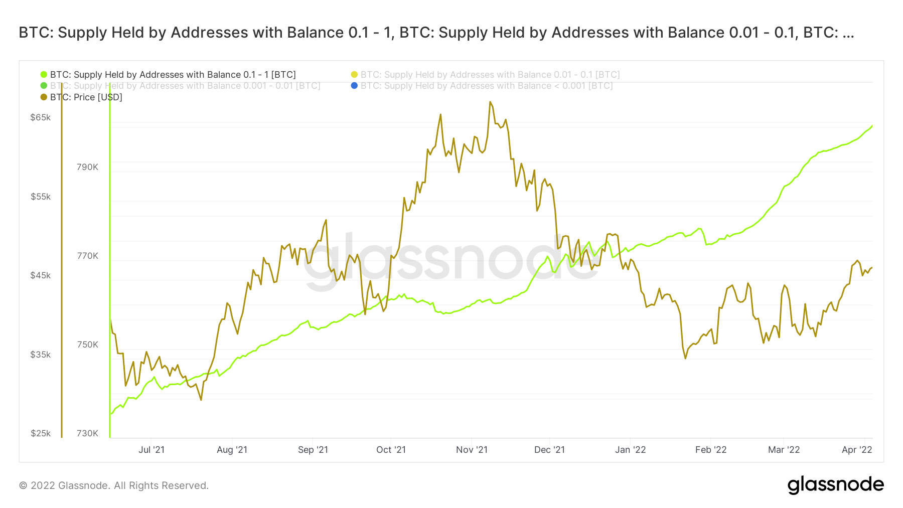 Giờ đây, các thực thể sở hữu từ 0,1 BTC đến 1 BTC kiểm soát tổng cộng gần 800.500 BTC.