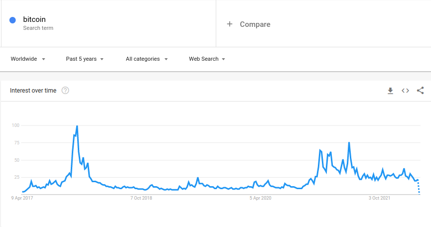 Không chỉ vậy, nhưng xu hướng vẫn đang giảm, Google gợi ý rằng Bitcoin sẽ nằm trong danh sách có lượng tìm kiếm tương đối thấp nhất trong nhiều năm nếu nó tiếp tục.