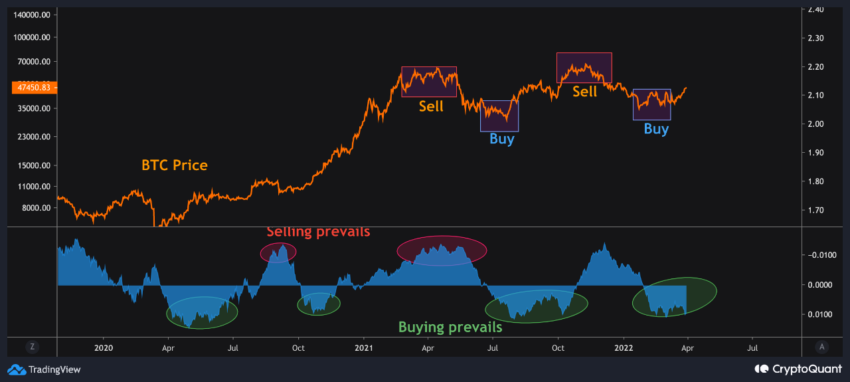 - Khi tỷ lệ này lớn hơn 0 thì có nghĩa khối lượng mua đã chính thức cao hơn khối lượng bán (của takers). Nhưng khi đó đã quá muộn cho một vị thế đẹp. Và thị trường khi đó sẽ sớm thay đổi trạng thái thành ngược lại.