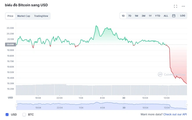 Theo dữ liệu từ CoinMarketCap, giá Bitcoin trong chiều 30/6 bất ngờ lao xuống sát mốc 19.000 USD. Đây là mốc giá trị được giao dịch thấp nhất trong vòng 7 ngày qua.