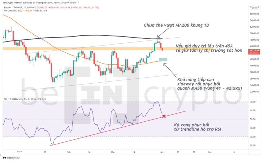 - RSI khung ngày đang tiếp cận trendline hỗ trợ kéo dài hơn 2 tháng. Nên có khả năng giá sẽ phục hồi khi đóng cửa trên trendline này. Mức giá sâu nhất có mà Bitcoin có thể thiết lập trong vài ngày tới có thể sẽ quanh MA50 (khoảng 41,000 ~ 42,000 USD).