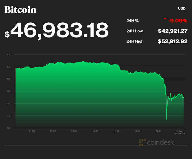 Theo dữ liệu của Coin Desk hôm 8/9, giá Bitcoin rớt mạnh từ mức cao trong vòng 24 giờ (gần 53.000 USD) xuống mức 42.900 USD. Sau đó, giá bật tăng phần nào lên 46.980 USD, ghi nhận mức giảm 9,09% so với một ngày trước đó.