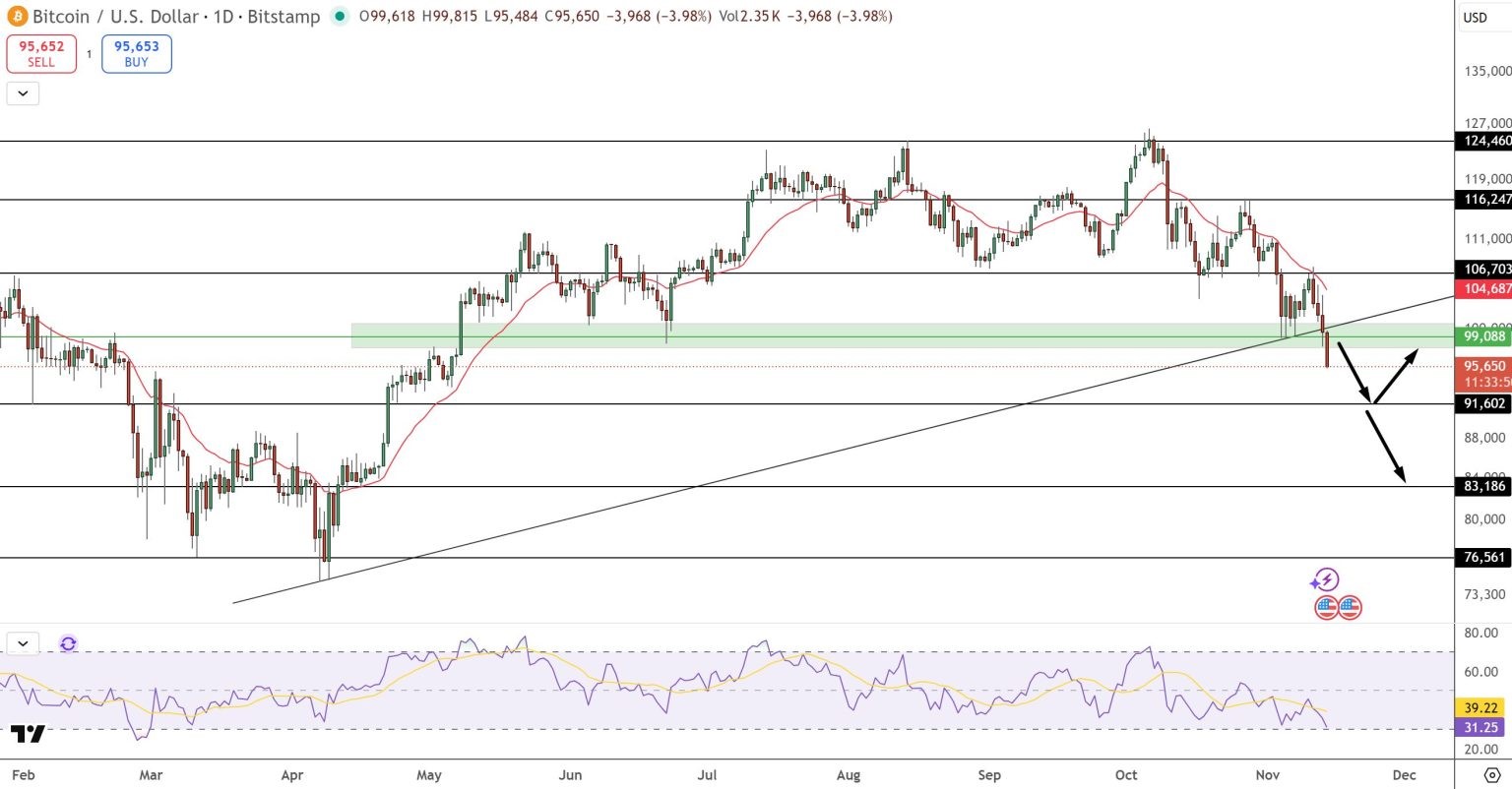 Nếu BTC tiếp tục bị từ chối quanh vùng 97.000–99.000 USD, giá có thể hướng về các mốc hỗ trợ kế tiếp: