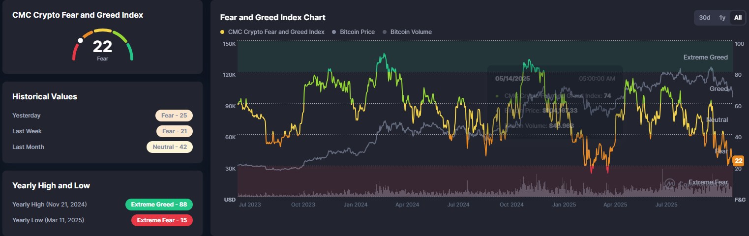 Chỉ số Fear & Greed Index giảm về mức 22, thấp nhất kể từ tháng 4, phản ánh sự thận trọng của nhà đầu tư. Dòng tiền vào thị trường crypto đi xuống khi so với các tài sản trú ẩn truyền thống.
